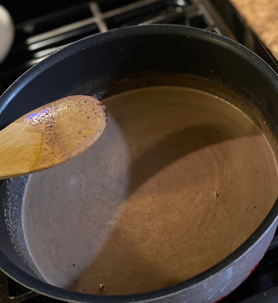 Add 2 cups of milk, 2 cups of heavy cream, at least 1 cup of chocolate chips (I use the whole bag), a splash of vanilla, and 1 teaspoon sugar to a medium sized pot.